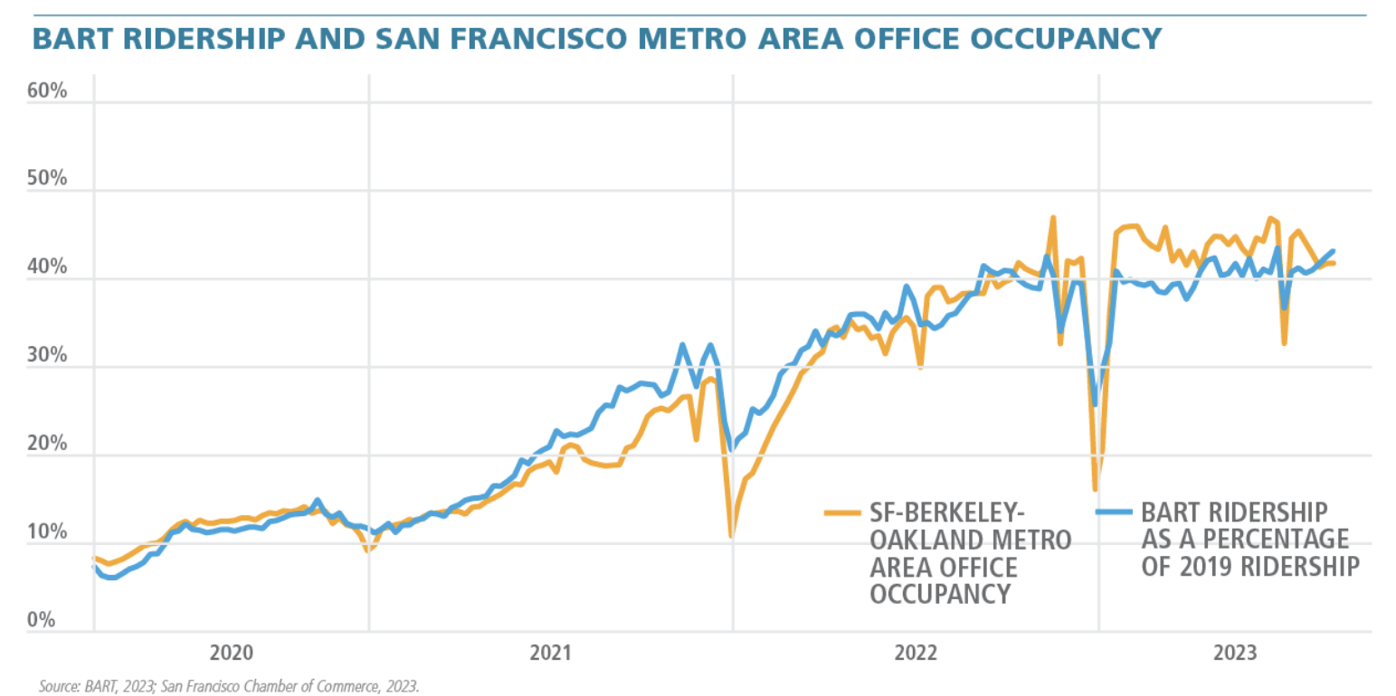 Mirroring the Bay Area’s office vacancy rate, BART’s ridership is stuck at around 40% of pre-pandemic levels. Source: BART