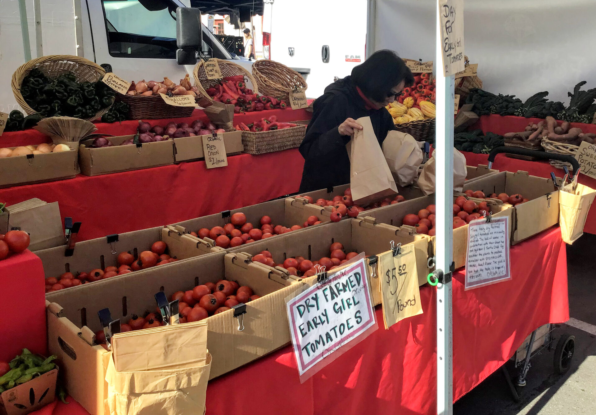 As summer dryness stretches into winter this year, dry-farmed tomatoes still dominate displays at a San Francisco farmers’ market. Photo: Ariel Okamoto