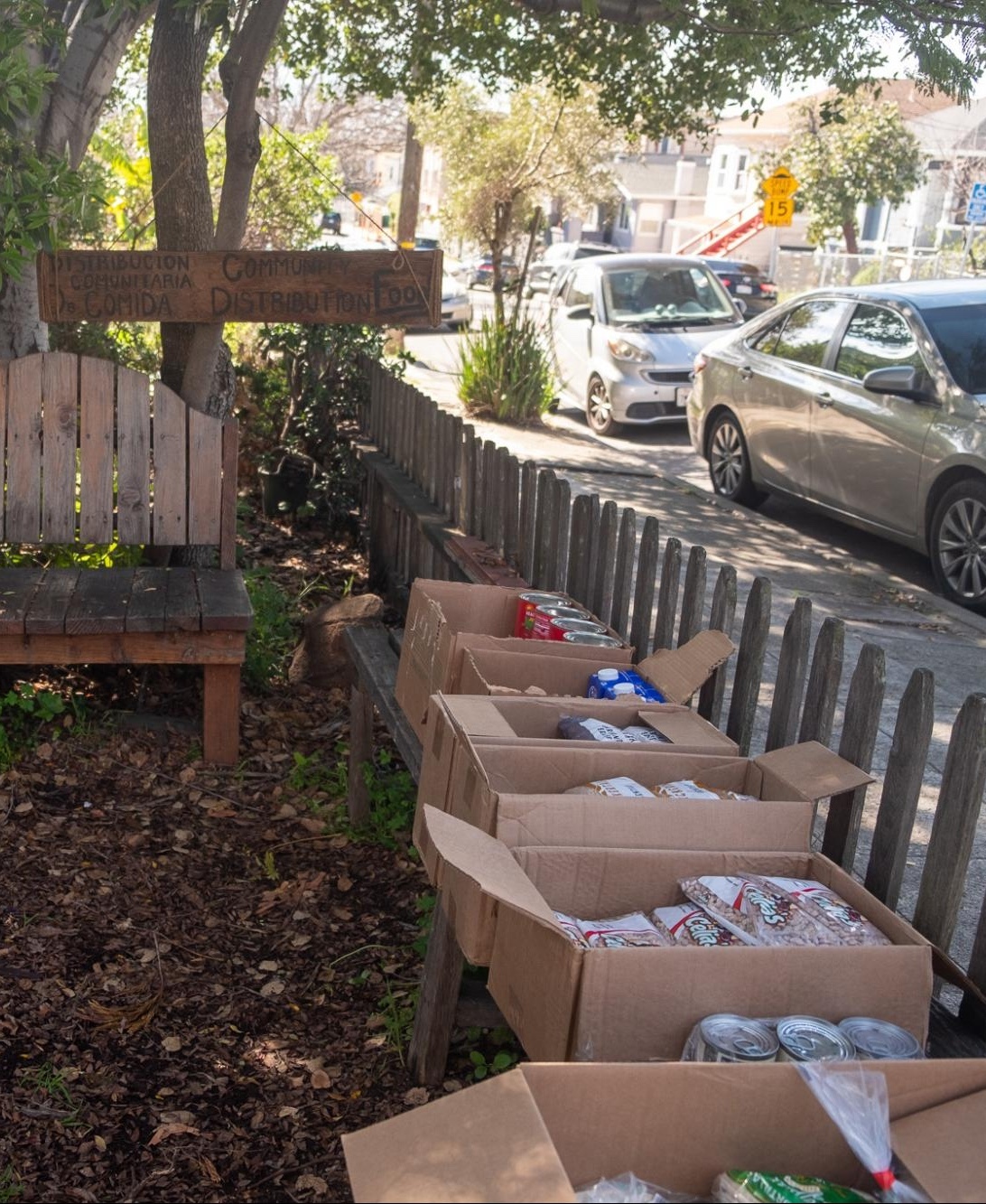 En un viernes por la tarde reciente, en un modesto jardín casero en una calle residencial en el este de Oakland, se observaban varias cajas de tubérculos, verduras, leche, tomates enlatados y pan fresco. Los vecinos iban y venían, y llenaban sus bolsas con los alimentos gratuitos.