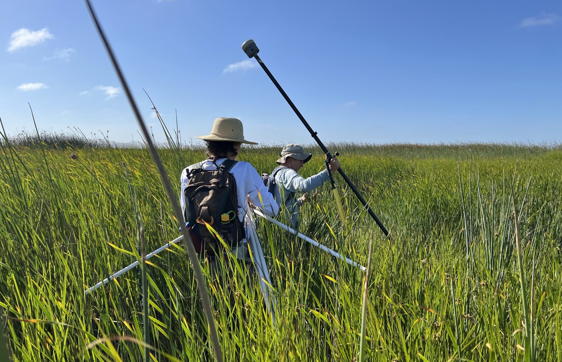 Chris Janousek and Evan Melendez collect RTK points out in the marsh to ground-truth and apply a "vegetation correction" to the lidar based digital elevation model. Photo: Jim Hobbs