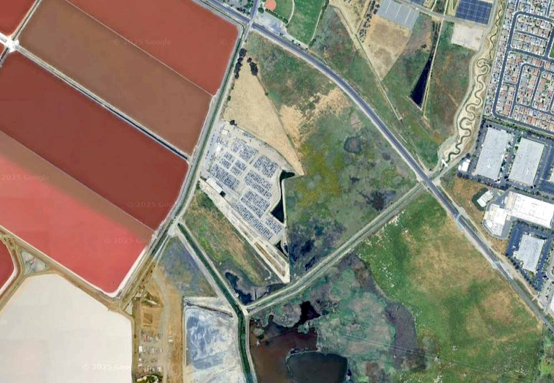 Junkyard site surrounded by orange salt ponds and open space. Photo: Google