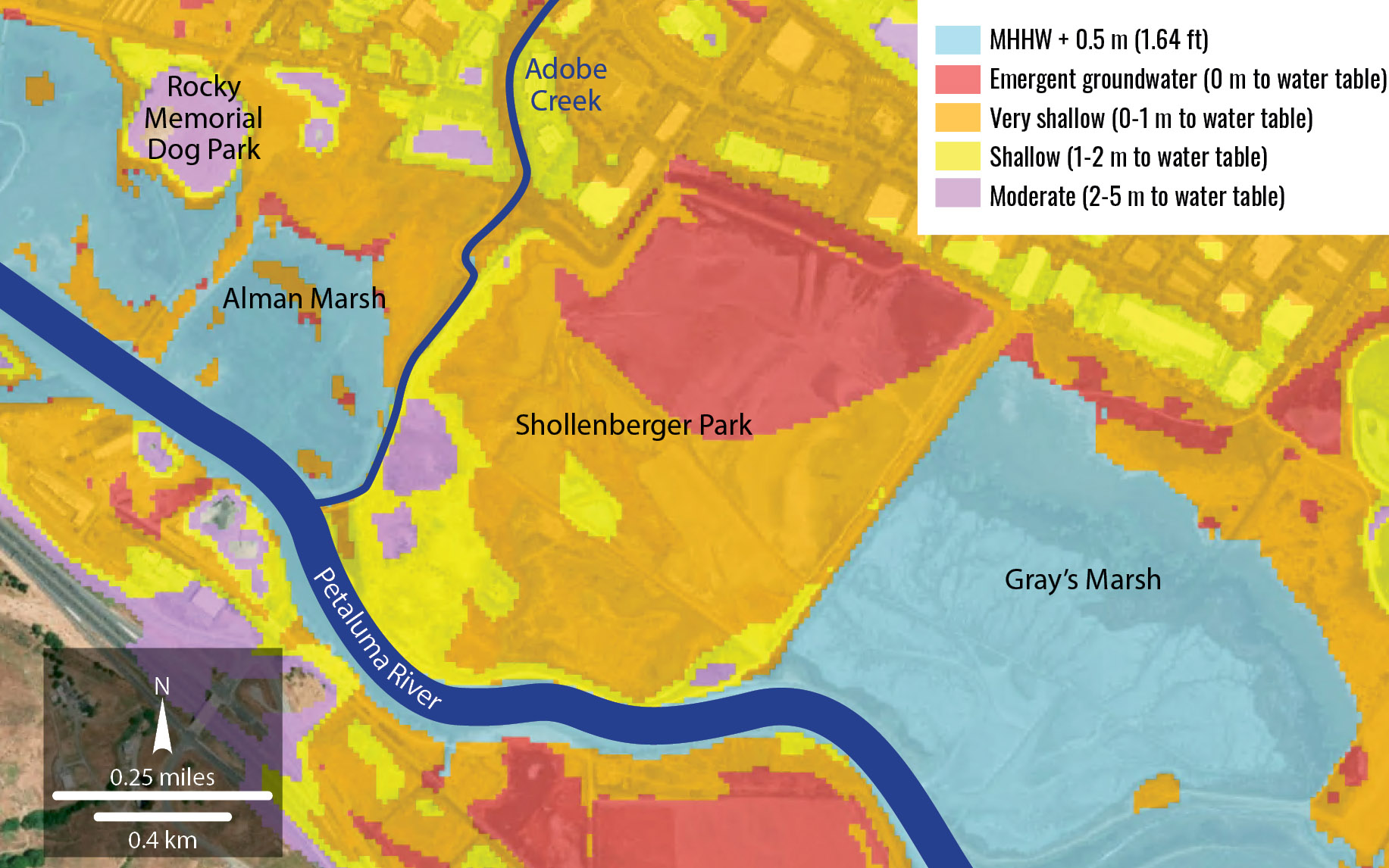 “We’re going to lose Alman Marsh for sure, and will lose parts of Shollenberger Park between now and 2050 to 2075,” says Petaluma Councilmember and Petaluma Wetlands Alliance President John Shribbs. “We’re going to lose them to sea level rise anyway, so we might as well start preparing now.”