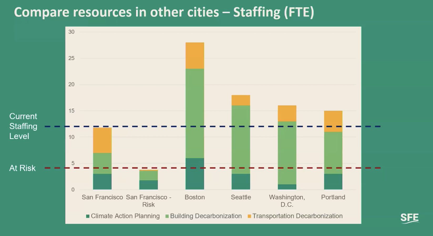 And perhaps most significantly, he presented a graph showing the environmental staffing of some of San Francisco’s peer cities (Boston, Seattle, Portland, and Washington, D.C.) with similar populations and budgets. All four employ more people, and while San Francisco has a similar number of staff working on climate action planning and clean transportation, it lags way behind on its investment in people working on building decarbonization.
