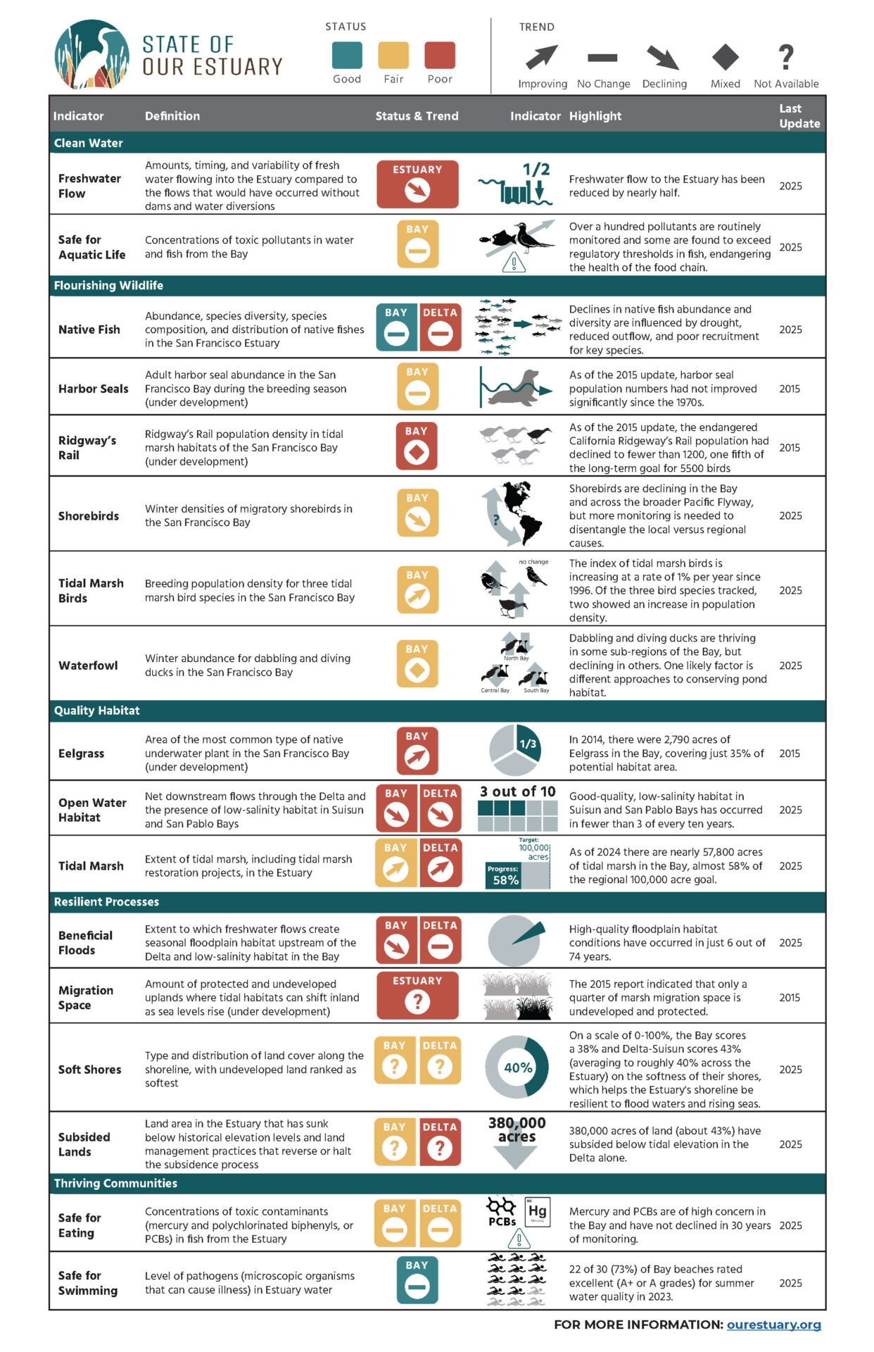 The 2025 State of Our Estuary assessment, released this fall at a regional conference, takes the pulse of the San Francisco Estuary in 17 indicators. It’s a health checkup for over 38 million acres of interconnected rivers, bay, and marsh, revealing which restoration efforts are paying off and where our waterways are still struggling to catch their breath.