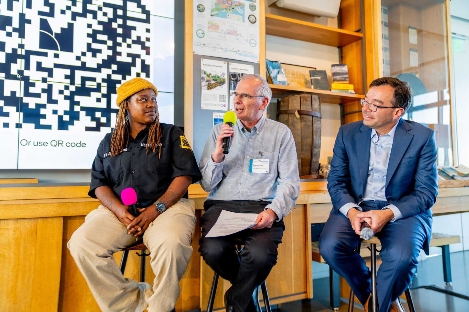 Planner and organizer Keta Price, the San Francisco Estuary Institute’s Jeremy Lowe and the Port of San Francisco’s Luiz Barata were honored at the 2025 Bay Adapt Summit. Photo: Ida Høyrup/Explatorium