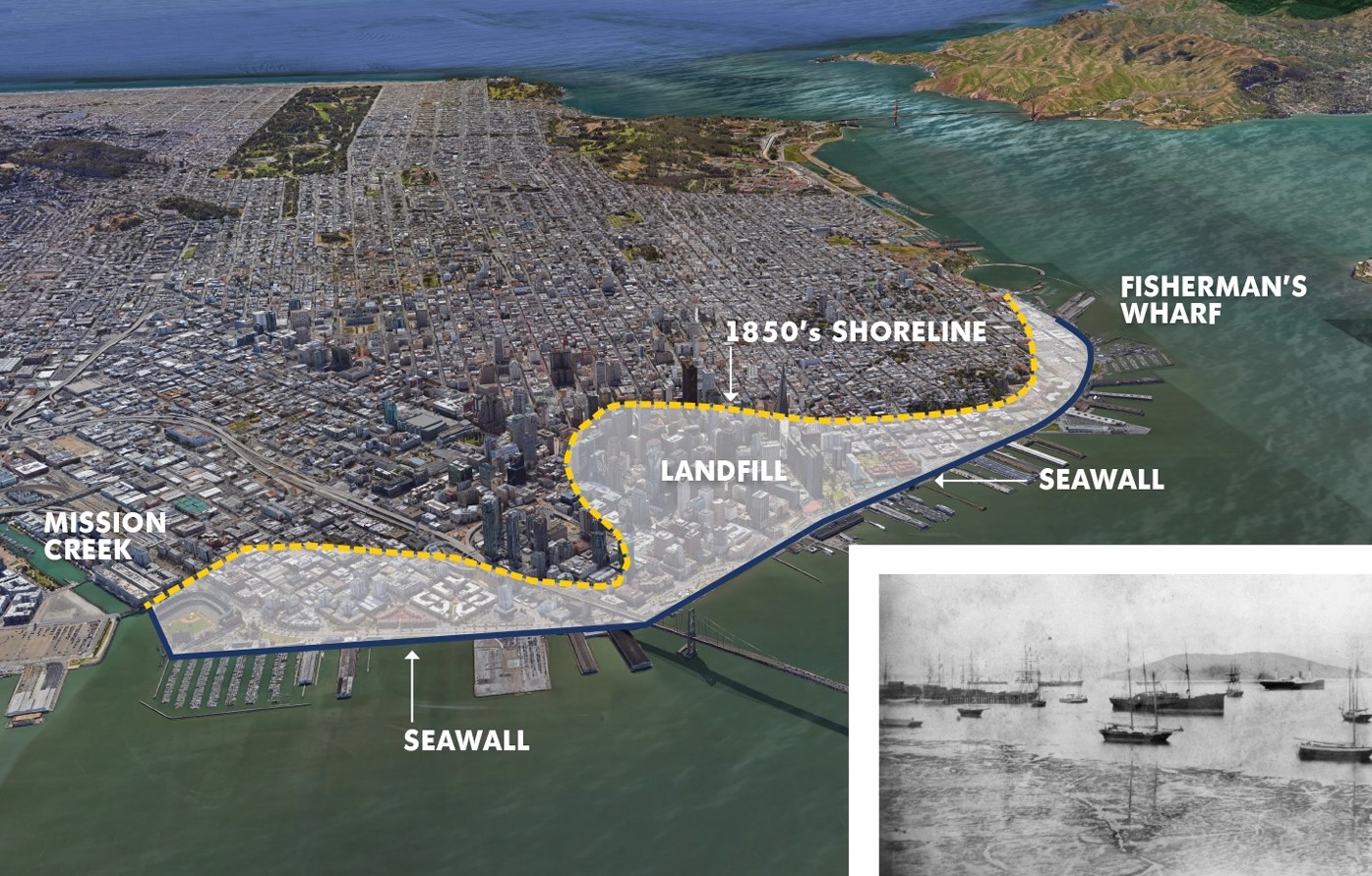 Areas that have been filled along San Francisco’s downtown shoreline. The seawall transformed 500 acres of tidal flats into new land. Graphic: Port of SF